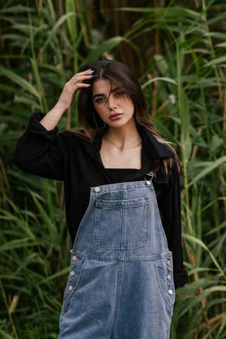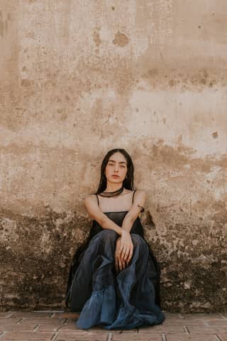A woman in an elegant blue gown sits against a weathered vintage wall, exuding grace and serenity.