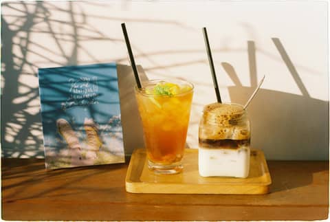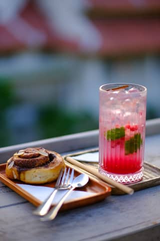 A cinnamon roll and refreshing drink served on a wooden table in Hue, Vietnam, outdoors.
