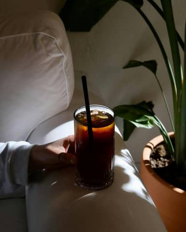 Relaxing indoors with a refreshing iced coffee beside lush greenery.