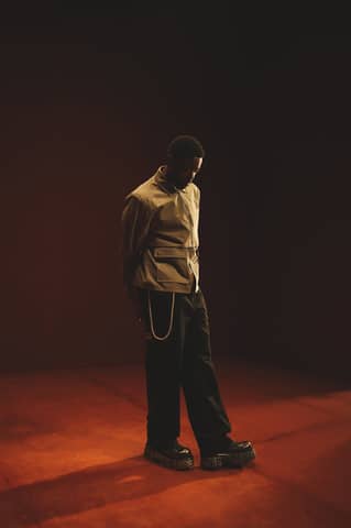A captivating portrait of a woman in front of a crescent moon shadow on an orange backdrop.