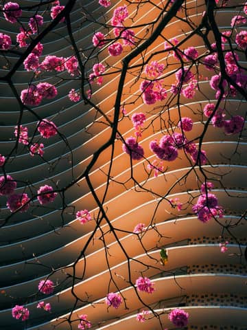 Pink blossoms juxtaposed with modern architecture in Belo Horizonte, Brazil.