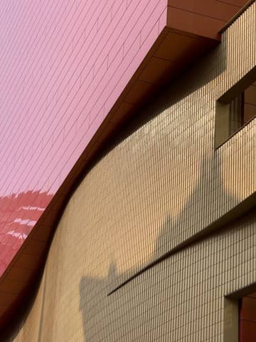 Abstract view of a modern building with pink and gold exterior featuring geometric patterns.