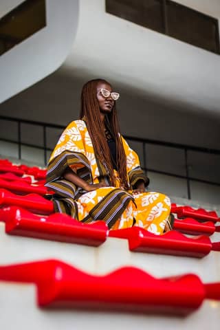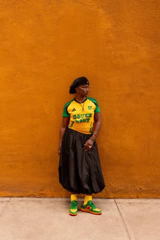 Fashionable adult in colorful attire posing against a vivid orange wall.