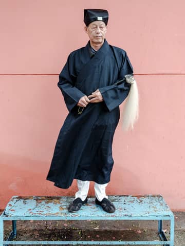Elderly man in traditional Asian attire poses against a pink wall, displaying cultural heritage.
