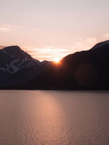 Stunning view of the sunset over majestic Norwegian fjords with vibrant hues.