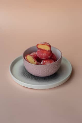 Frozen mochi spheres in a pink bowl on a pastel background create a minimalistic and vibrant food composition.