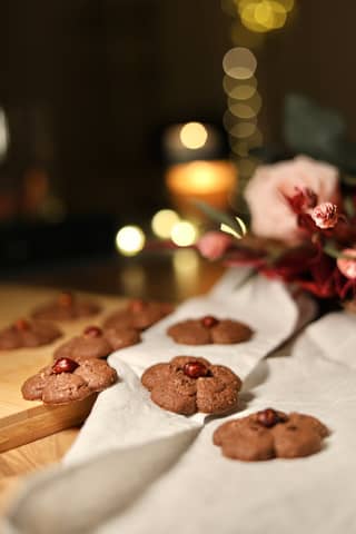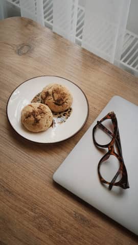 A cozy workspace setup with cookies, a laptop, and reading glasses on a wooden desk.