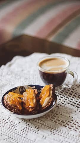 Top view of a stylish coffee table setting with cups, saucers, and assorted sweets.