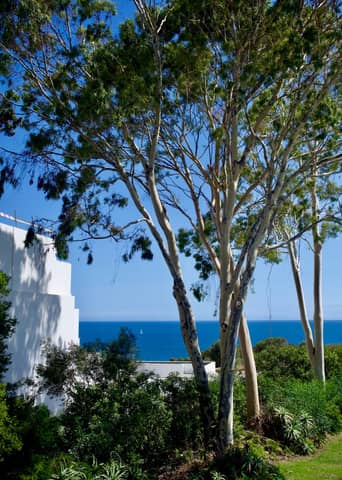 Tranquil view of Mediterranean coastline framed by lush eucalyptus trees under a clear blue sky.
