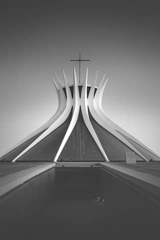 A striking view of Brasília's Cathedral with unique design in monochrome, showcasing modern architectural brilliance.