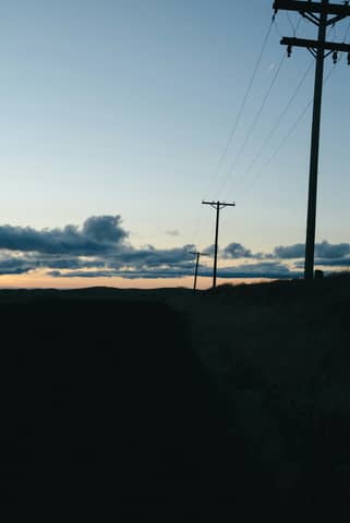 Sunset sky over power lines and fields.