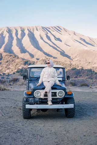 A stylish woman in a white dress sits on a yellow jeep, enjoying a sunny coastal day.