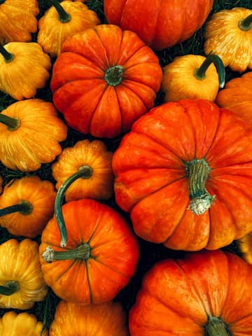 Colorful display of orange pumpkins and gourds capturing the essence of fall harvest.