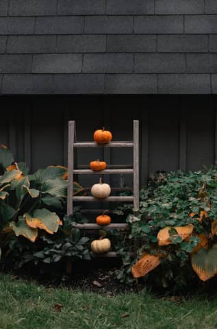 Vibrant pumpkins and flowers adorn steps, celebrating autumn.
