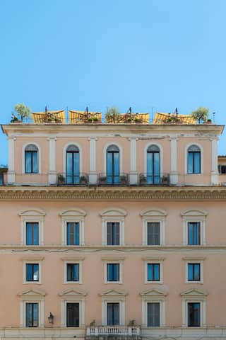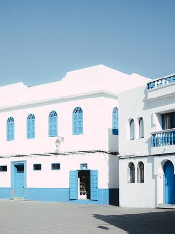 Vintage Mediterranean house with car covered in the driveway under a bright sky.