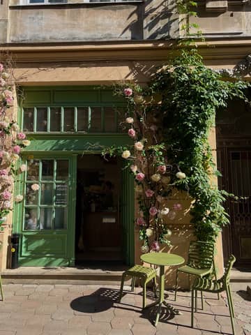 Charming outdoor facade with a bicycle and vibrant pink bougainvillea climbing the wall.