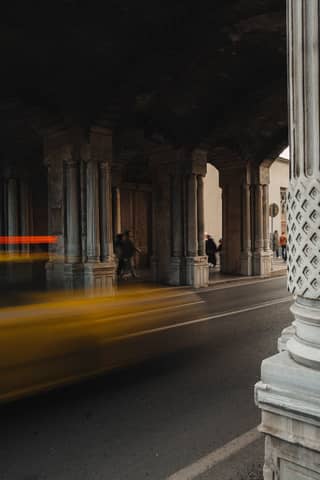A yellow taxi blurs by as it passes under ornate stone arches in an urban setting, adding dynamic motion.