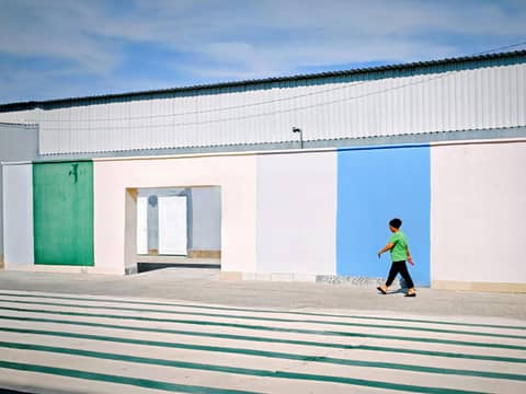 A person walks outdoors reflected in a modern glass facade, creating unique shadows.