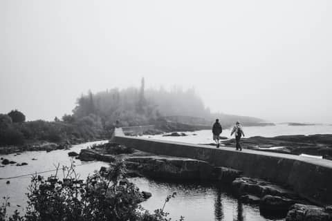 Two individuals walk along a misty pier extending into the fog over the water's edge.
