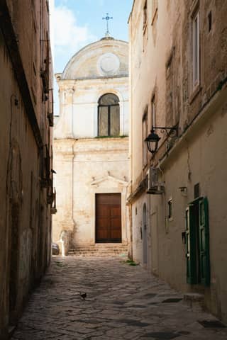 A narrow street leads to a church.