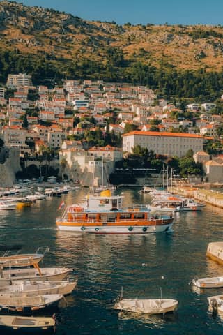 Ship sailing on Bosphorus Strait framed by buildings in Istanbul, under a clear sky.