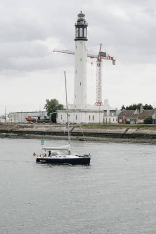 A sailboat passes a lighthouse under cloudy skies in Dunkerque, France.