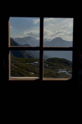 Vintage wooden house facade with charming window and vibrant potted flowers.