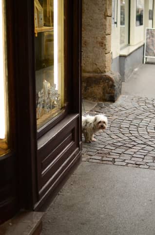 A cute small dog peeking from a shop entrance on a cobblestone street in Graz, Austria.
